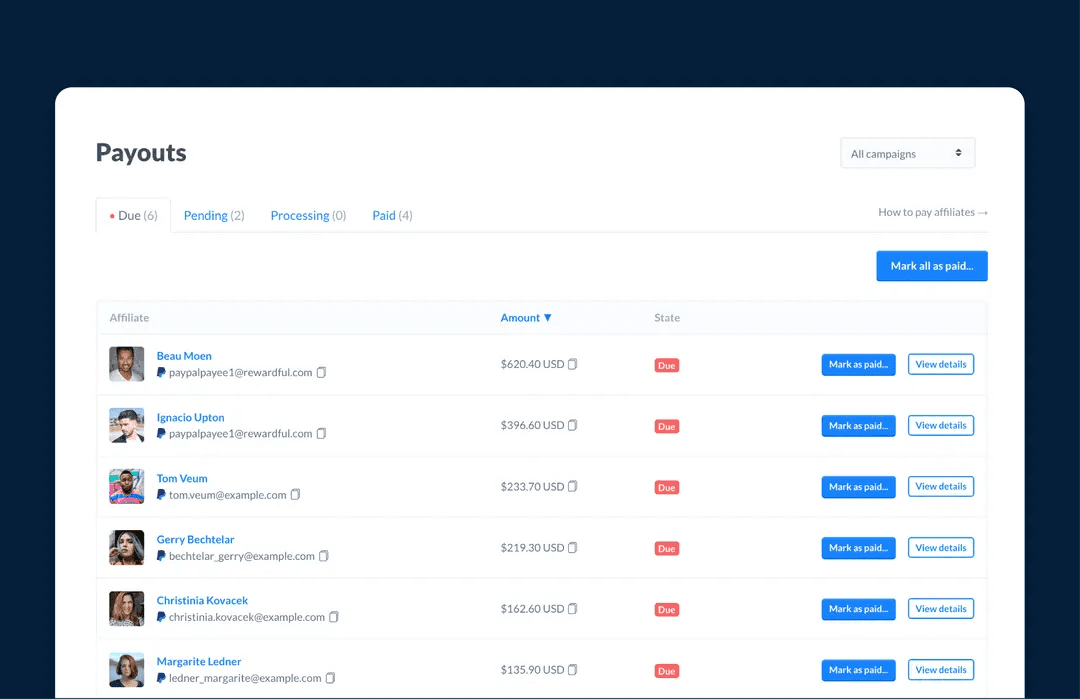 Rewardful connects directly to Stripe and offers flexible commission structures tailored to your needs. It also streamlines affiliate payouts with PayPal and Wise mass payment features, allowing businesses to pay their affiliates in seconds—saving time and enhancing efficiency.